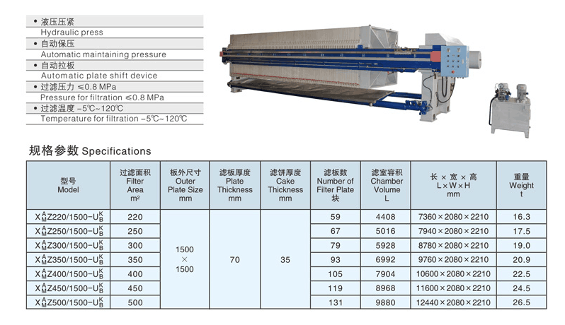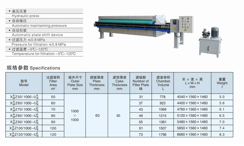 1、采用液壓系統(tǒng)控制,電氣控制元件均采用名牌產(chǎn)品,可實(shí)現(xiàn)手動(dòng)控制和全電腦程序自動(dòng)控制采用液壓裝置作為壓緊,松開濾板的動(dòng)力結(jié)構(gòu),